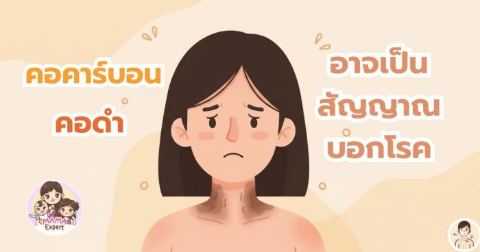 คอคาร์บอน อาจเป็นสัญญาณของโรคบางชนิด ซึ่งสามารถทำให้ผิวเข้มขึ้น อาจส่งผลให้เกิดความดำคล้ำ และเป็นรอยดำได้ การตรวจวินิจฉัยและรักษาโรคพื้นฐานเหล่านี้อย่างทันท่วงที จะช่วยลดอาการคอดำและฟื้นฟูสุขภาพผิวได้ในระยะยาว เช่น